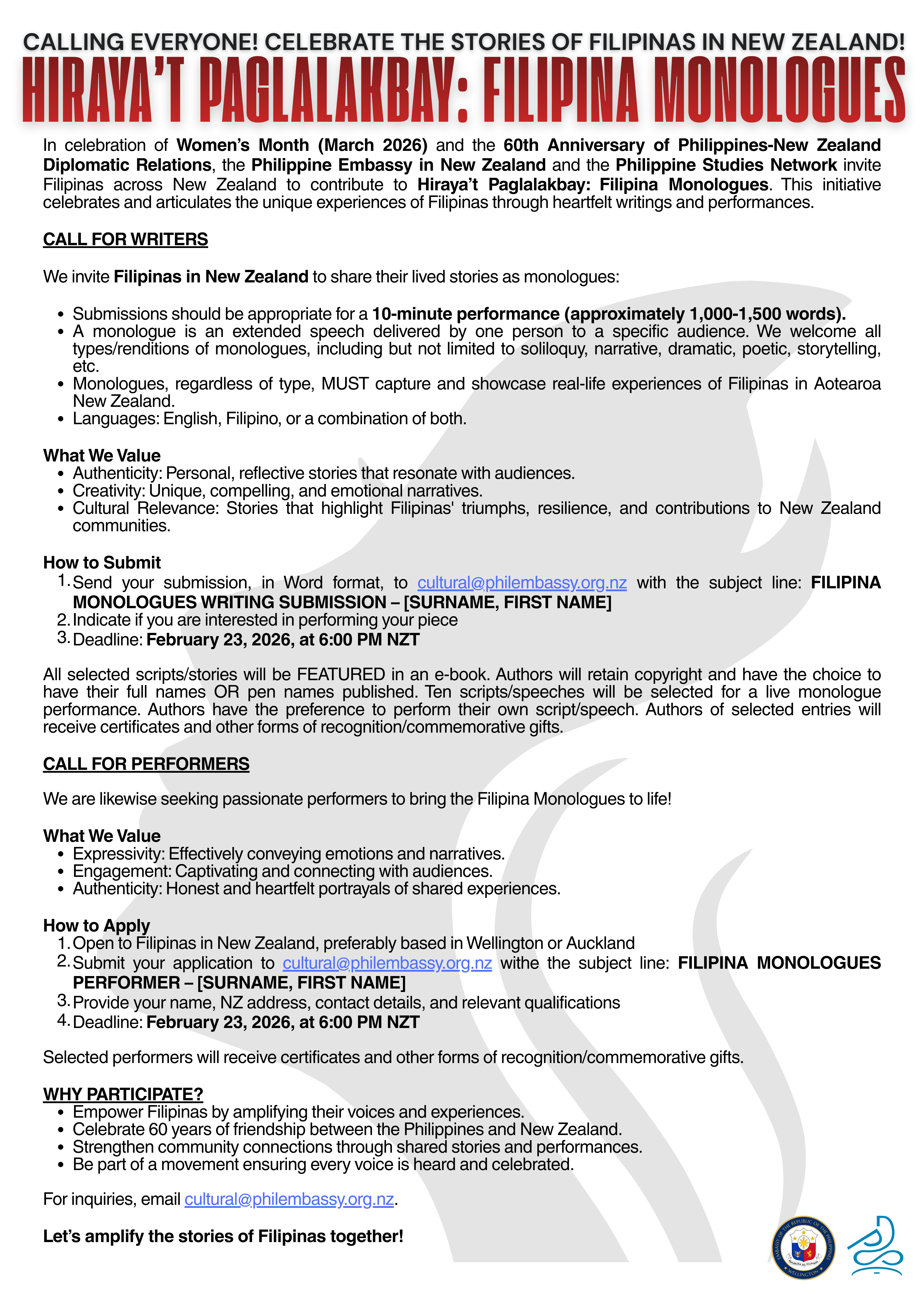 In celebration of Women’s Month (March 2026) and the 60th Anniversary of Philippines-New Zealand Diplomatic Relations, the Philippine Embassy in New Zealand and the Philippine Studies Network invite Filipinas across New Zealand to contribute to Kabayan Monologues. This initiative celebrates and articulates the unique experiences of Filipinas through heartfelt writings and performances.