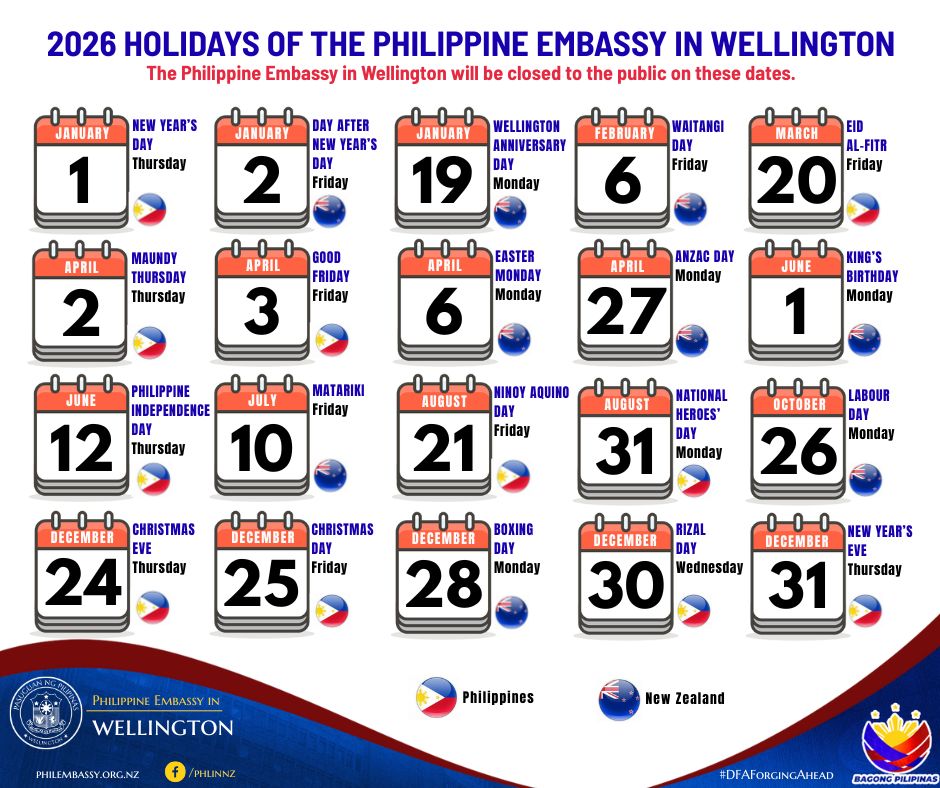 Here’s the list of Philippine and New Zealand holidays that the Embassy will observe in 2026.